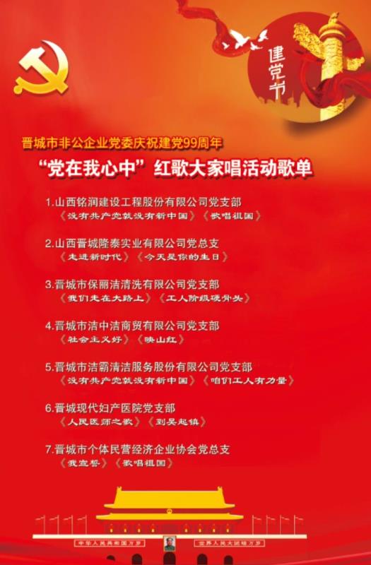 為了慶祝中國共產(chǎn)黨建黨99周年,6月28日,晉城市非公企業(yè)黨委在澤州天泰錦辰煤業(yè)有限公司組織開展了“黨在我心中”紅歌大家唱活動,潔霸清潔黨支部全體黨員及公司骨干參加演唱活動。